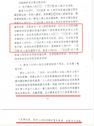 购买公民个人信息后拉人进群炒股,后端涉嫌诈骗被害人,前端行为如何定性?第一被告人刘某中及其公司全部员工被指控诈骗罪、侵犯公民个人信息罪两罪,公诉机关认为后端公司涉嫌诈骗,故认定作为前端公司的人员(刘某中及其公司员工)是诈骗罪的帮助犯。控辩审三方多次交流,刘某中两罪的量刑建议十一年以上十四年以下(不认罪认罚),后经拉锯磋商降为七年以上(认罪认罚),与第二被告人丁某松一样。但开庭时,在全部被告人认罪认罚的情况下,丁律师敢于坚持独立辩护,顶住压力做无罪辩护。最终,无罪辩护成功。法院仅判决侵犯公民个人信息罪一罪(诈骗罪无罪),量刑六年有期徒刑,比最开始的量刑建议整整减少了八年。