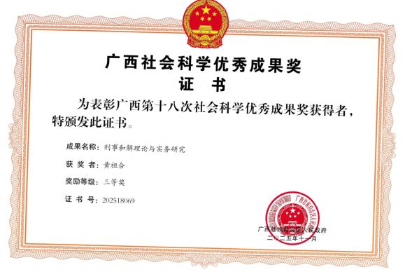 2025年5月28日,两年一度的广西哲学社会科学第18次优秀哲学社会科学评选结果揭晓,黄祖合博士大律师所撰写的学术著作《刑事和解理论与实务研究》(中国政法大学出版社2022年版)参评,并在激烈的竞争当中脱颖而出,黄祖合博士大律师该部专著荣获广西壮族自治区第18次哲学社会科学优秀成果三等奖。广西壮族自治区人民政府于2025年11月向黄祖合博士大律师颁发《广西社会科学优秀成果奖证书》,证书编号为:202518069,并颁发奖金。证书如下: