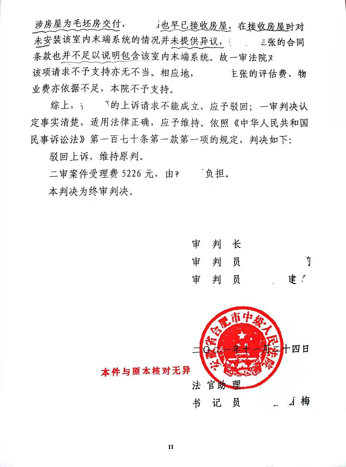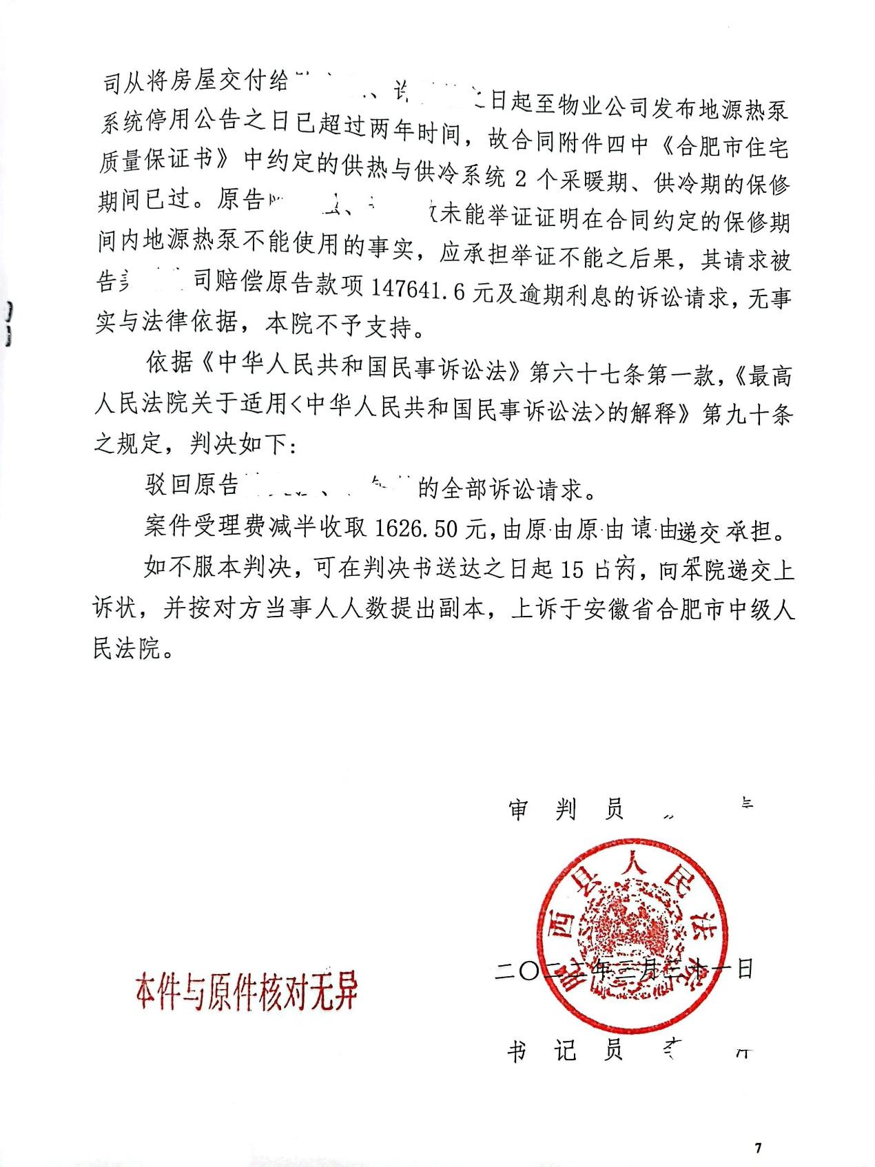 目前六户业主因地源热泵系统的停用起诉开发商,其中五户业主的案件已经经过一审、二审审理,一审驳回五业主的诉讼请求,二审维持原判。另外一户业主的案件经过一审审理,已驳回原告的全部诉讼请求。六案件的接连胜诉也证明了代理律师的专业性判断,主要观点均被法院采纳,同时赢得了委托人的连连称赞。