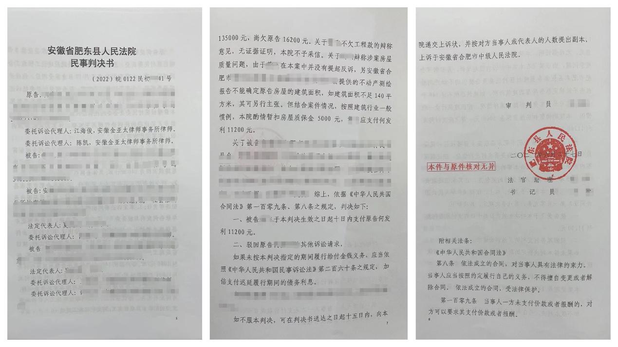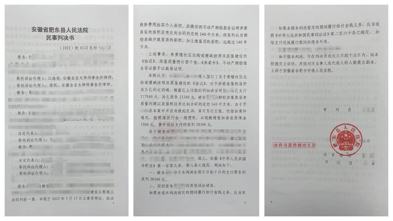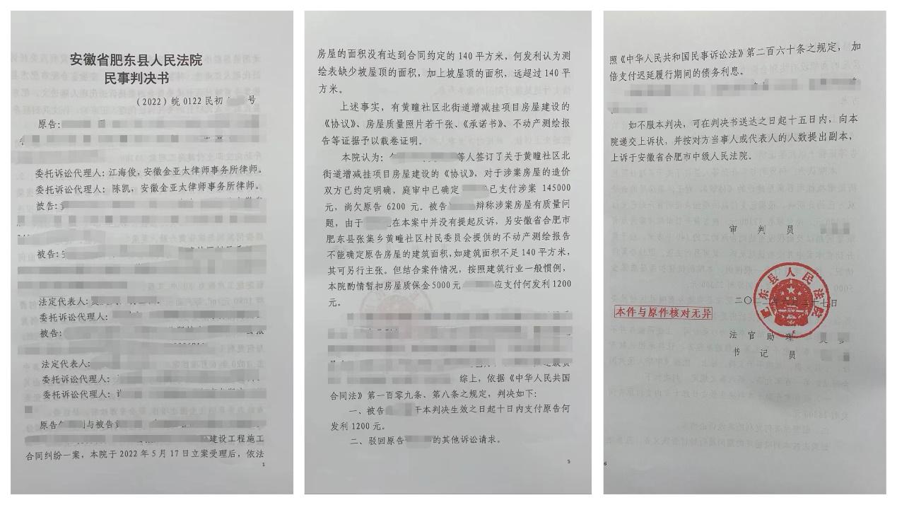 金亚太不动产与建设工程部江海俊、陈凯律师接受委托后,认为本案缺乏建设工程施工案件所必需的基本诉讼资料,决定前往工程所在地及村委会实地调查了解案件的相关情况。据村委会负责人介绍,该工程并非由村委会发包。建房协议是由全体村民与委托人之间自愿签订,并由村民代表在协议上签字确认,村委会在其中仅是见证人,并非发包人。已付工程款均由村委会从指定管理人账户转入委托人账户。另外,据村委会负责人介绍,委托人承建的房屋面积经肥东县不动产登记中心测绘,达不到140㎡,且房屋还存在严重的质量问题。