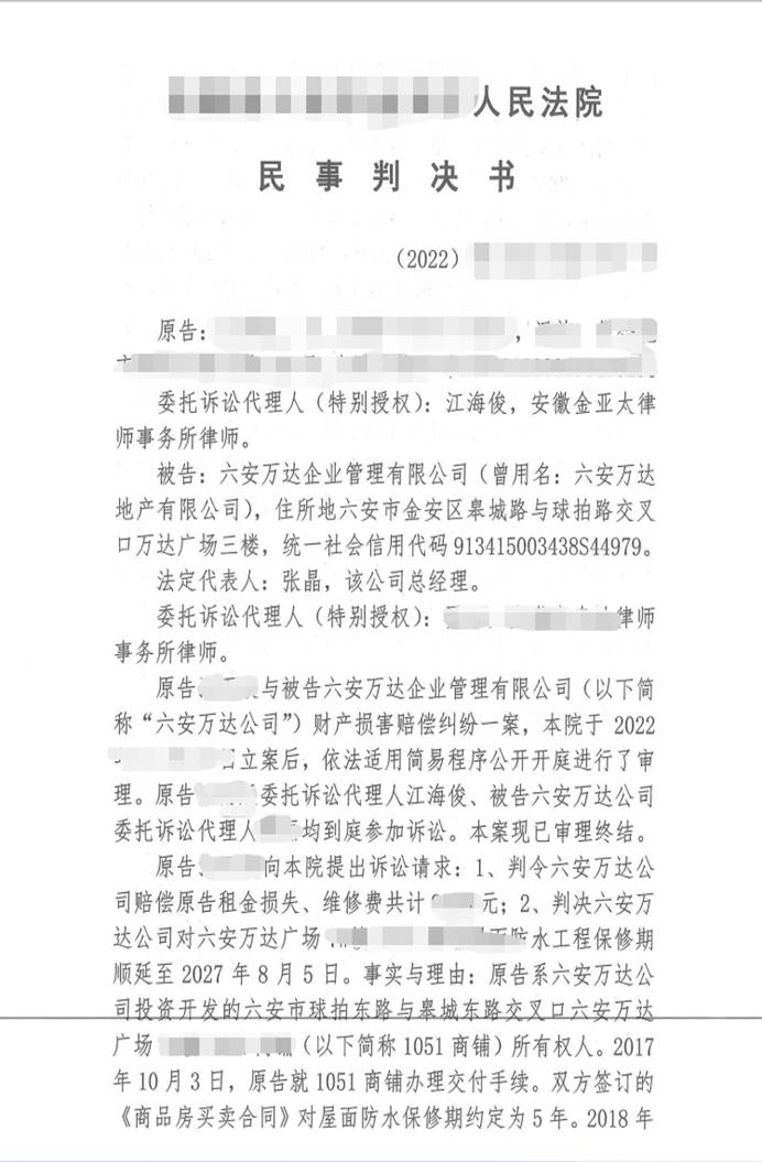 承办律师在诉前与A某积极沟通,了解双方争议焦点及赔偿损失依据,做好证据收集工作,在与万达公司协商未果的情况下,迫不得已诉至法院,请求判令万达公司赔偿A某商铺维修费、租金损失,并顺延保修期。法院受理后,承办法官本着实事求是,明辨是非的办案宗旨,在疫情期间亲临商铺屋顶漏水现场踏勘,为正确裁判打下基础。此案完全胜诉,证明了金亚太律师的专业水准,承办法官认真负责的态度,让A某深切感受到社会主义国家法制的公平与正义。