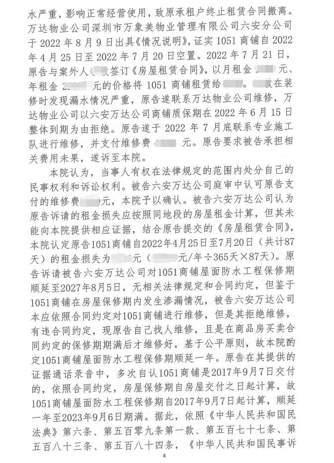法院判决:万达公司赔偿A某租金损失、维修费,并顺延商铺屋面防水工程保修期一年。
