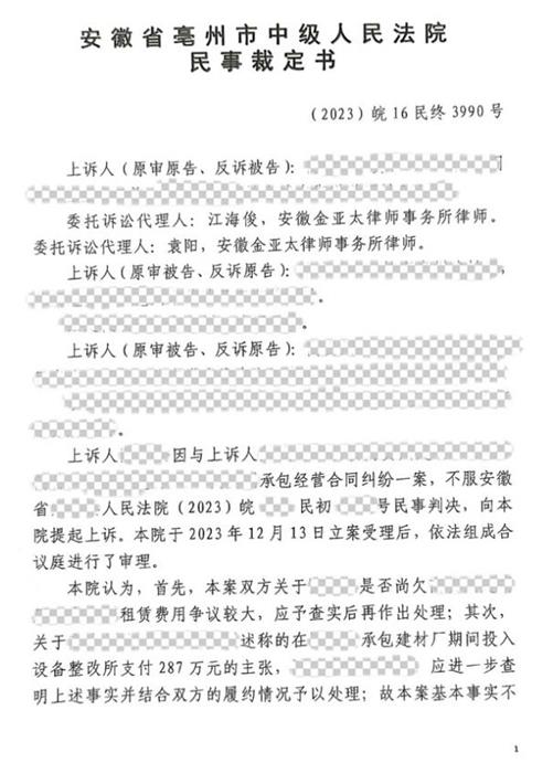 2019年2月,委托人陈某与蒙城县某建材厂签订了《承包经营合同》,合同约定由陈某承包经营该建材厂,承包期10年,年承包款238万元,履约保证金39万。陈某接手建材厂后,支付了373万元承包款,另花费142万元用于增购设备,但建材厂因环保问题一再被当地环境保护局行政处罚并要求整改,陈某于2020年7月就没有再继续生产经营。2021年4月份建材厂整改完毕后,建材厂老板高某在未通知陈某的情况下将建材厂擅自转租给他人生产经营,陈某得知后起诉到法院要求解除双方合同,退还履约保证金并赔偿违约金500万元。诉讼中建材厂提起反诉,要求陈某继续支付32万多元的承包费和整改费用287万元。一审判决陈某需支付建材厂承包费4.7万元,整改费80万元及相关设备改造费16万元。陈某作为原告不仅没获得赔偿,反而判决其向被告支付100余万元,愤愤不平向金亚太律所求救。律所在了解情况后,指派不动产与建设工程部办理,由于案件复杂,争议巨大,江海俊主任决定亲自办理,袁阳作为出庭律师。