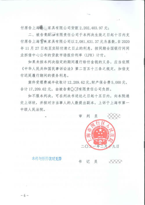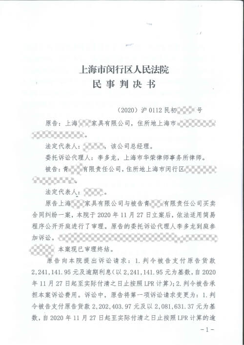 原告上海某某家具有限公司与被告青某某有限责任公司买卖合同纠纷案件,代理原告参加诉讼,原告诉请220余万元获全额支持。