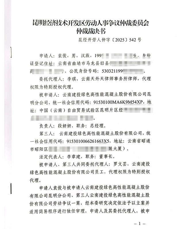 昆明经济技术开发区劳动人事争议仲裁委员会仲裁裁决书1