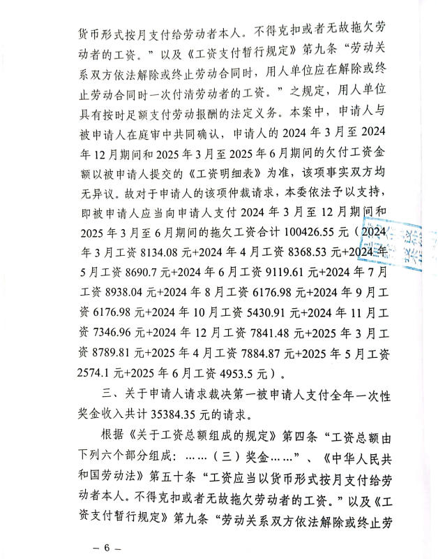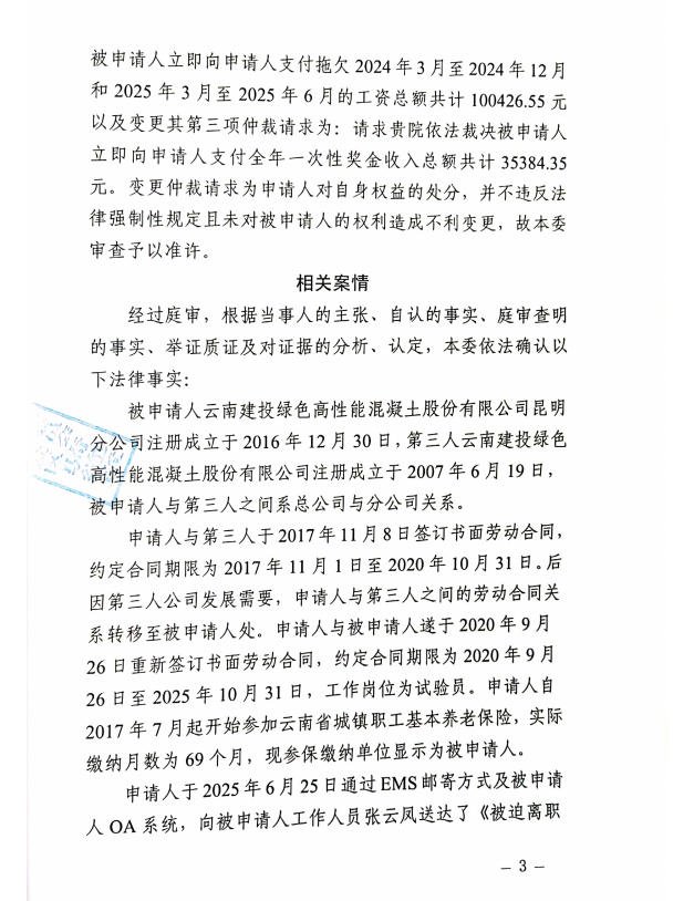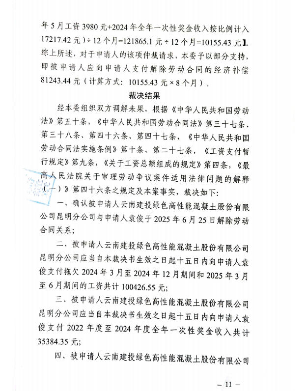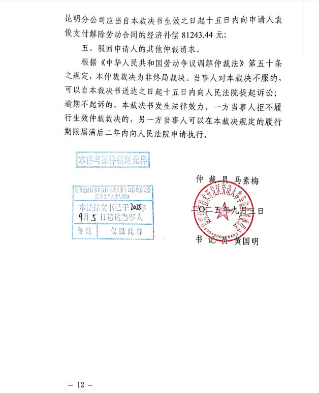 昆明市劳动人事争议仲裁院仲裁裁决书