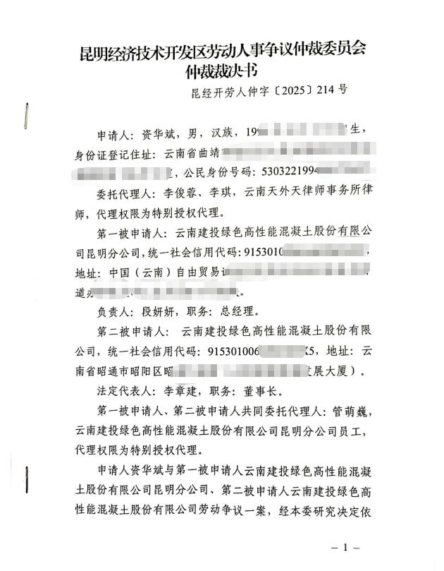 昆明经济技术开发区劳动人事争议仲裁委员会仲裁裁决书1