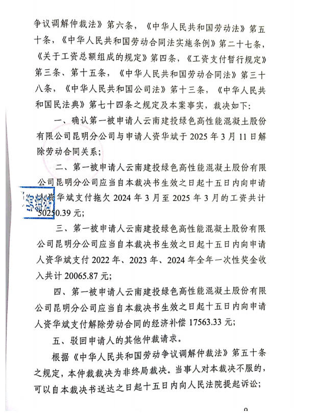 昆明市五华区劳动人事争议仲裁院 仲裁裁决书