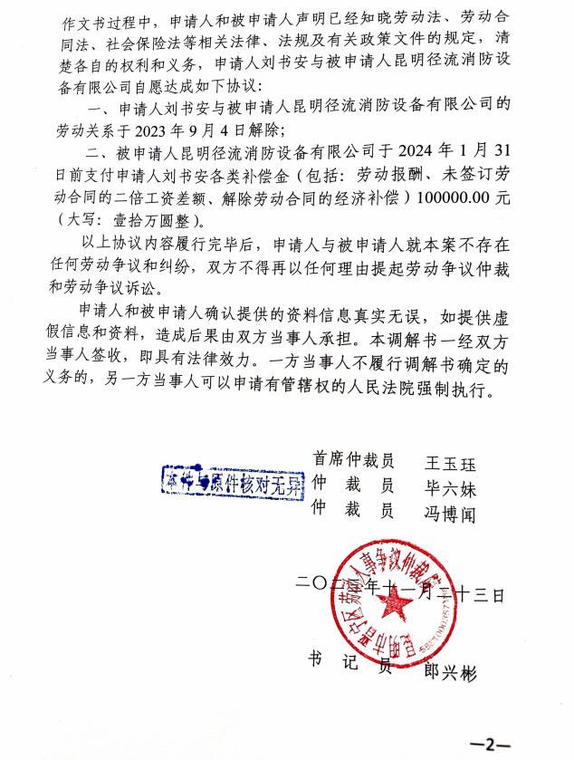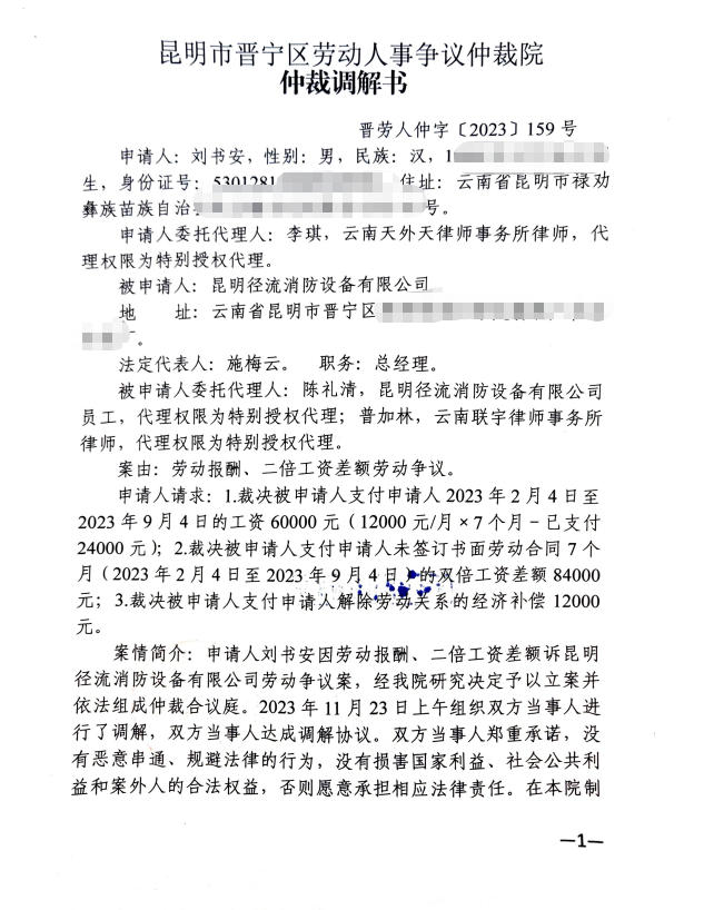 昆明市晋宁区劳动人事争议仲裁院仲裁调解书