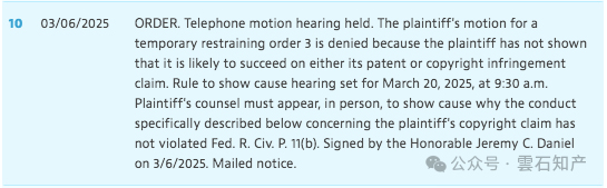 3月6日举行TRO动议听证会,法院基于我方提交的TRO反对动议当庭驳回了原告的TRO动议,并注意到我方Rule 11诉请,就原告的版权侵权主张当庭质疑其法律和事实依据,缺失版权证书和侵权行为,要求提供合理解释show cause。法院同意原告律师庭后补充证据。并排期于3月20日举行线下听证会。