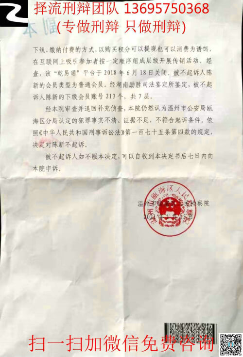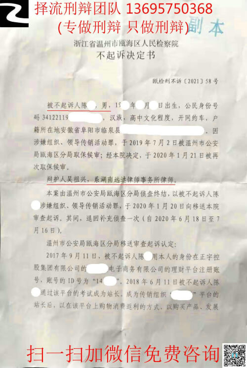 湖南择流刑辩团队第419个有效辩护案例,2021年度第3个有效辩护案例,第65个无罪不起诉案例,诈骗罪第55个有效辩护案例,组织领导传销活动罪第2个有效辩护案例。