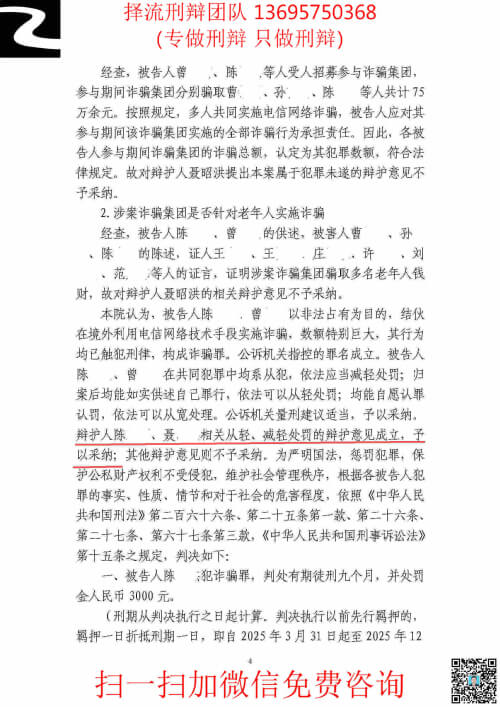 1、指控诈骗金额特别巨大(75万以上),法定刑有期徒刑10年以上,一个从犯情节争取到减轻两个档次量刑9个月,相当于刑期实报实销。