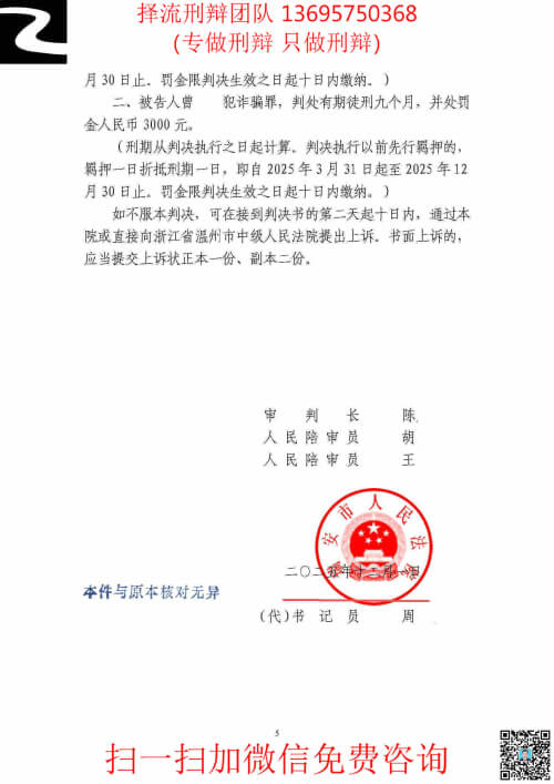 曾某某(系台湾人)涉嫌诈骗罪,于2025年04月14日被浙江省温州市瑞安市公安局刑事拘留,2025年05月21日被批准逮捕,瑞安市人民检察院指控曾某某涉诈金额75万元以上,系诈骗金额特别巨大,2025年12月01日,瑞安市人民法院采纳辩护人意见,以诈骗罪判处曾某某有期徒刑9个月,罚金3000元,曾某某可以在今年元旦前回台湾和家人团聚。