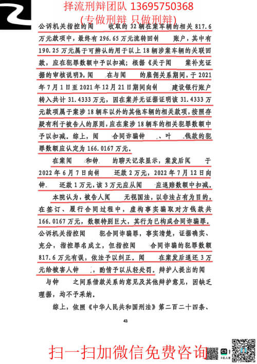 1、检察院指控闻某某合同诈骗817.6万元,法院只认定166.0167万元,减少认定数额651万余元。