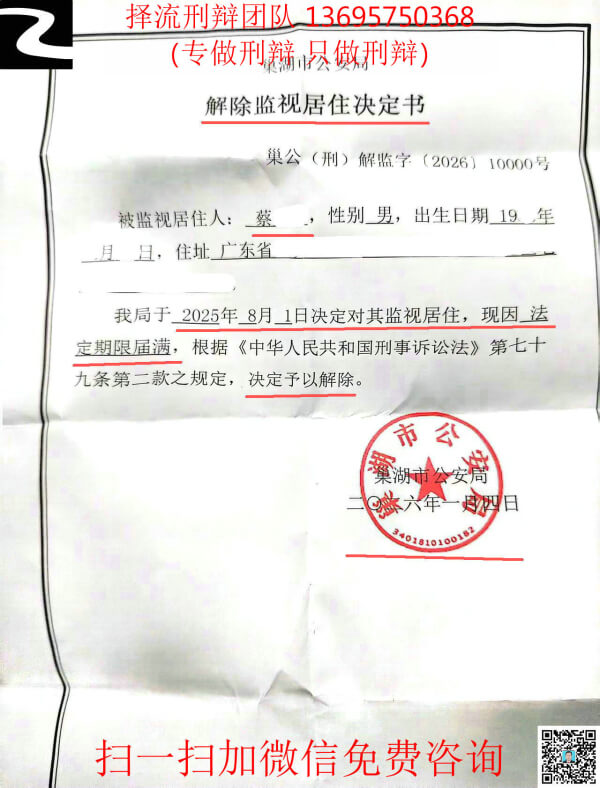 2026年01月04,巢湖市公安局对蔡某某解除监视居住,虽没拿到撤销案件文书,但实质上相当于蔡某某案已经终止侦查撤销案件了。