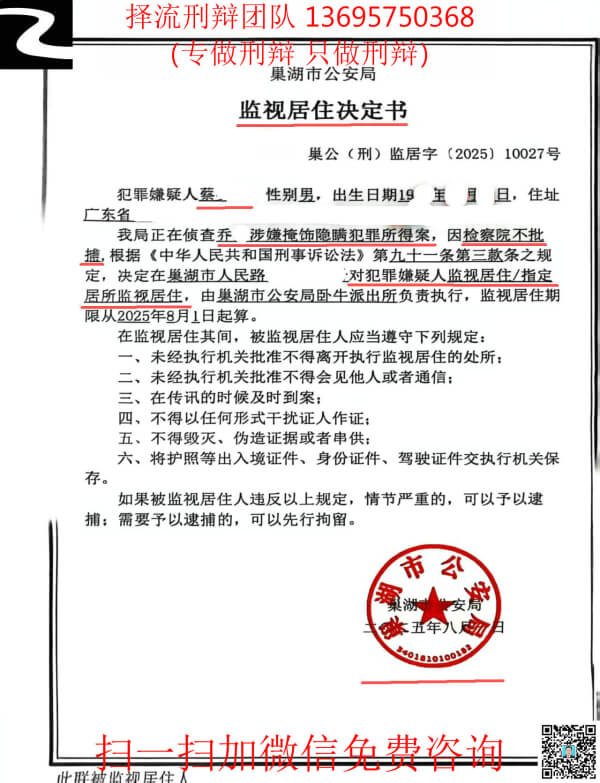 蔡某某涉嫌掩饰、隐瞒犯罪所得罪,系前罪刑满释放后5年之内再次涉嫌犯罪,2025年06月27日被安徽省巢湖市公安局刑事拘留,2025年08月01日因巢湖市人民检察院不批准逮捕,变更强制措施为监视居住(相当于取保候审),蔡某某重获自由。