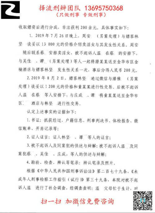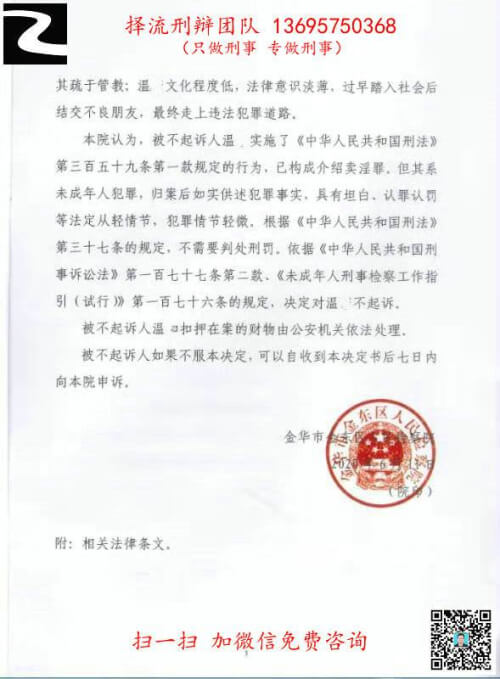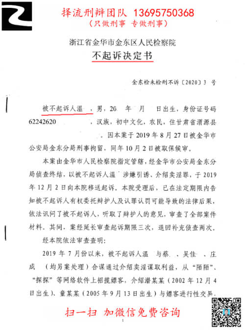 温某涉嫌强迫卖淫罪,2019年8月27日被浙江省金华市金东公安分局刑事拘留,同年10月2日取保候审,经和办案机关沟通,强迫卖淫罪变更为引诱、介绍卖淫罪,2020年6月11日,金华市金东区检察院认为温某犯罪情节轻微,决定对温某不起诉。承办律师湖南择流律师事务所聂昭洪、曾昊律师。