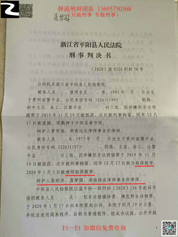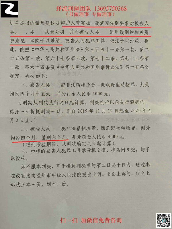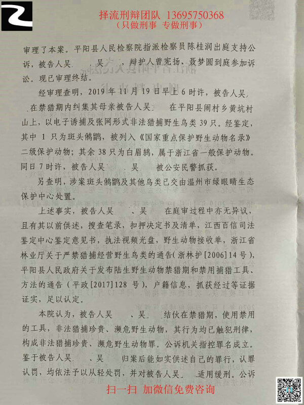 吴孟某犯非法狩猎罪,2019年11月20日被浙江省温州市平阳县公安局刑事拘留,同年12月17日取保候审,平阳市检察院指控吴孟某犯非法猎捕珍贵、濒危野生动物罪,2020年3月20日平阳县人民法院判处吴孟某拘役4个月,缓刑6个月