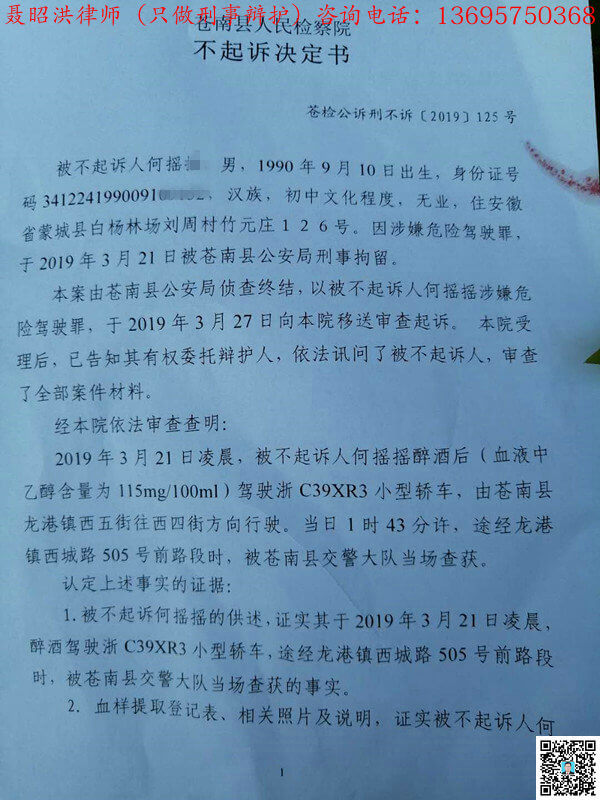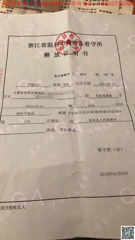 何摇某涉嫌危险驾驶罪.,2019年3月21日被温州苍南县公安局刑事拘留,经辩护,苍南县检察院决定对何摇某不起诉,2019年4月4日何某不需要去法院判刑而释放。(190402)