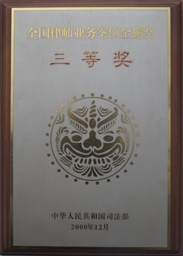 2000年获司法部首届全国律师业务案例“金獬奖”三等奖;