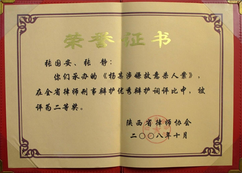 2008年获陕西省律师刑事辩护优秀辩护词二等奖;