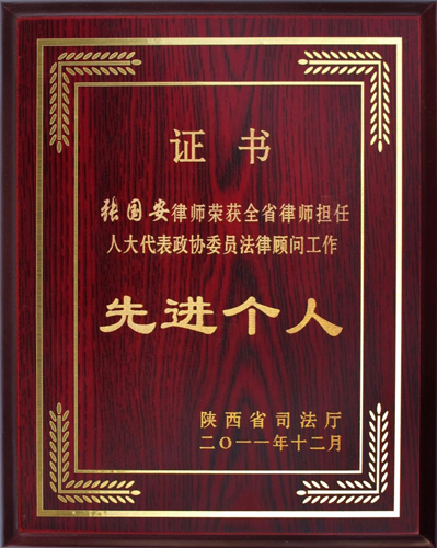 2011年获陕西省司法厅律师担任人大代表政协委员法律顾问工作先进个人;