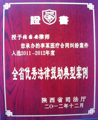 2013年与倪景红律师合办的李某医疗合同纠纷案入选2011——2012年度陕西省优秀法律援助典型案例。