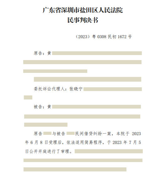 黄某民间借贷纠纷一案(案号:2023粤0308民初1672号),代理原告黄某,帮助黄某追回借款本金及利息6万余元;