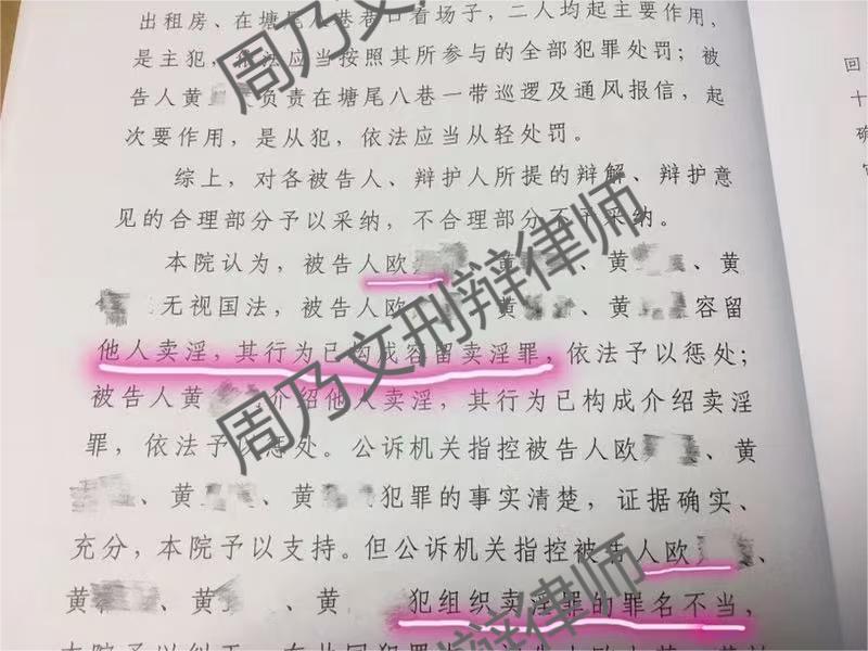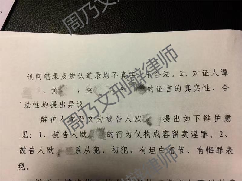 法院采纳了律师周乃文的辩护观点,认定欧某某构成容留卖淫罪,在量刑上直接减少三年。此次辩护成功改变了罪名认定,大幅度减轻了欧某某的刑罚,有力维护了当事人的合法权益。