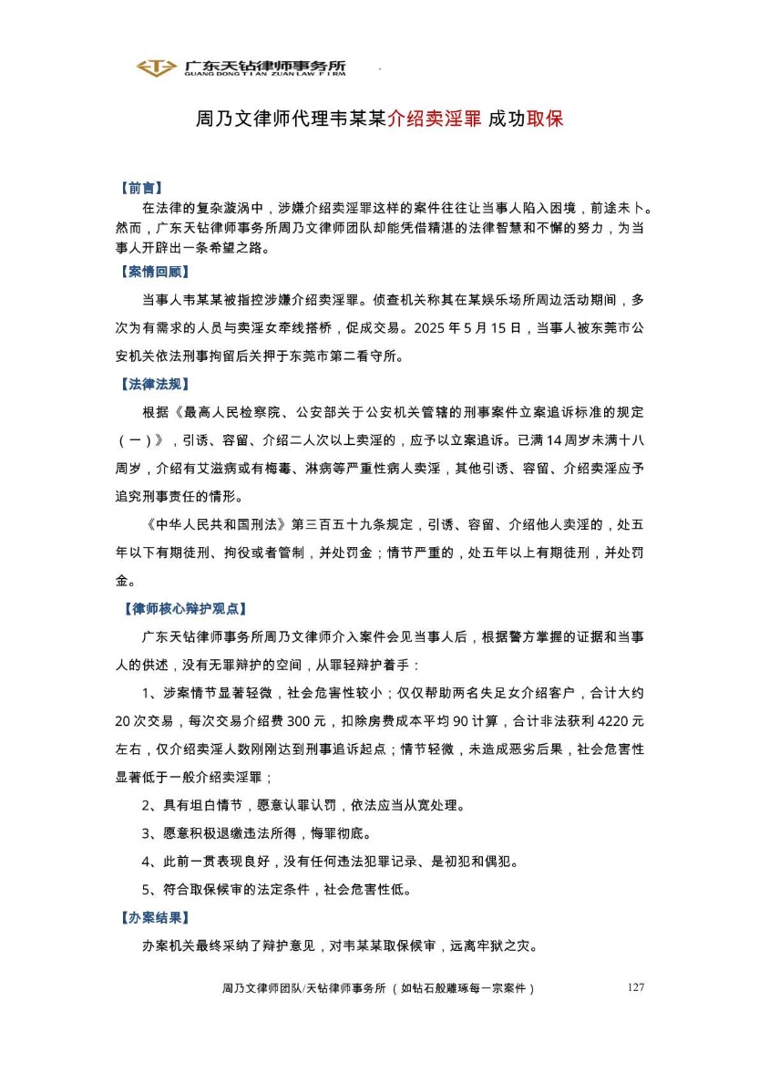 周乃文律师代理冯某介绍卖淫罪 成功取保候审