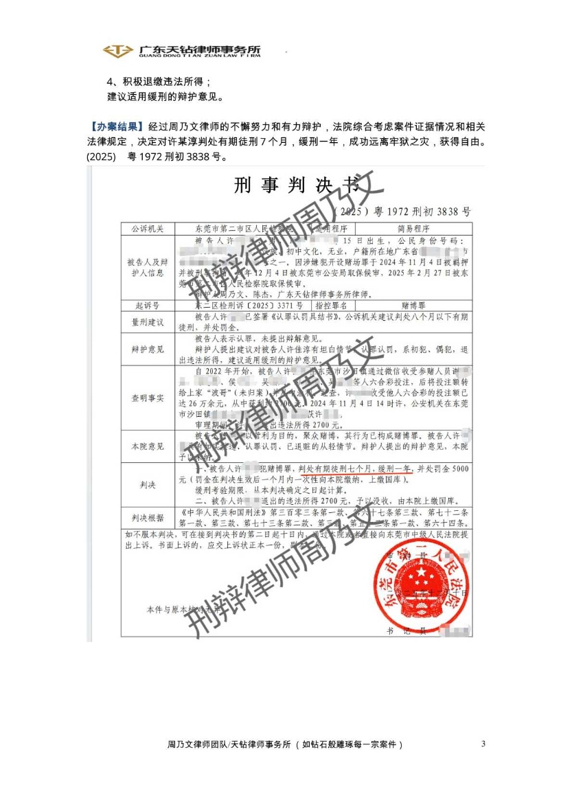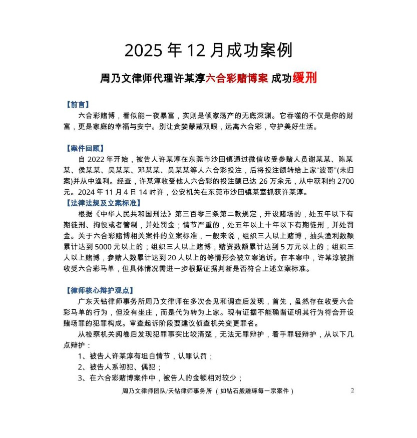 2025年12月成功案例 周乃文律师代理许某淳六合彩赌博案成功缓刑