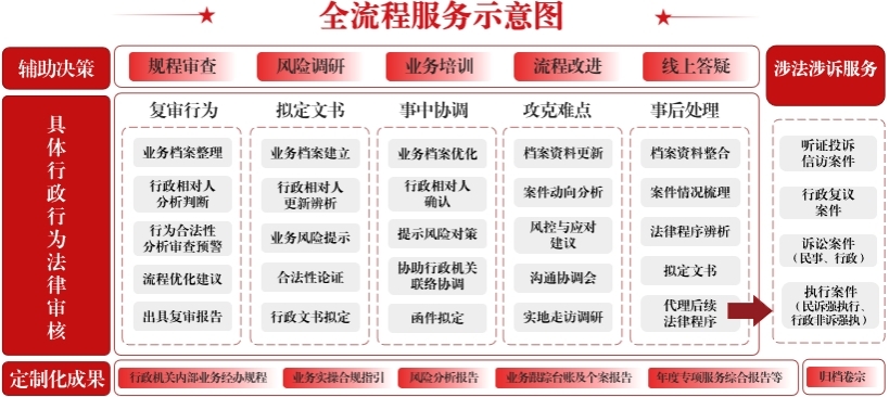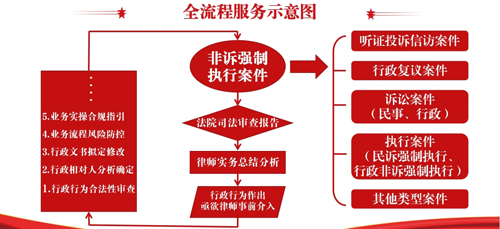 “规程审查→风险调研→文书拟定→节点监控→涉法涉诉服务→结果复盘”六步闭环,为行政行为的依法作出及行政非诉执行提供强有力的一站式、全方位、全流程、全周期护航。
