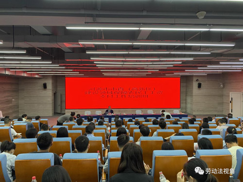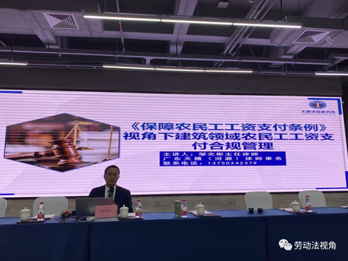 本次讲座由河源市劳动监察大队麦伟东队长主持,邹光彬律师受邀开展《保障农民工工资支付条例》专题讲座,参与人员有市住建局、市交通局、市水务局等行业主管部门人员、市直(高新区)各在建工程项目的建设单位项目负责人、施工总承包单位项目负责人及劳资专管员、劳务分包单位及专业分包单位项目负责人。