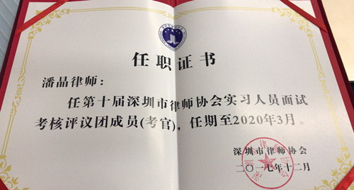 广东风泽律师团首席潘晶律师受深圳律师协会聘任,续任第十届深圳市律师协会实习人员面试考核评议团成员(考官)。潘晶律师自2015年受聘担任考核官以来,多次参与对实习律师的执业评定考核,日后继续秉承客观公正原则,积极履行考官职责。