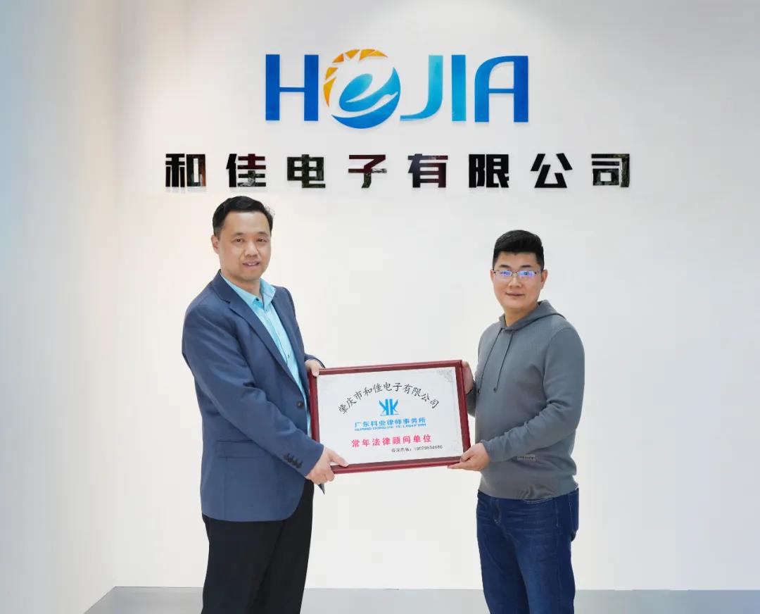 近日,广东科业律师事务所主任律师韩伟华律师来到了肇庆市和佳电子有限公司,并为其挂上了法律顾问的牌匾。并参观了该企业运营情况,解答了其常年的法律问题。