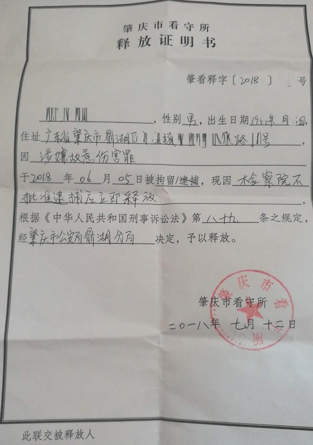鼎湖一位明先生因涉嫌故意伤害罪被拘留,其家人向广东科业律师事务所寻求法律帮助,经科业律师介入后被释放了。