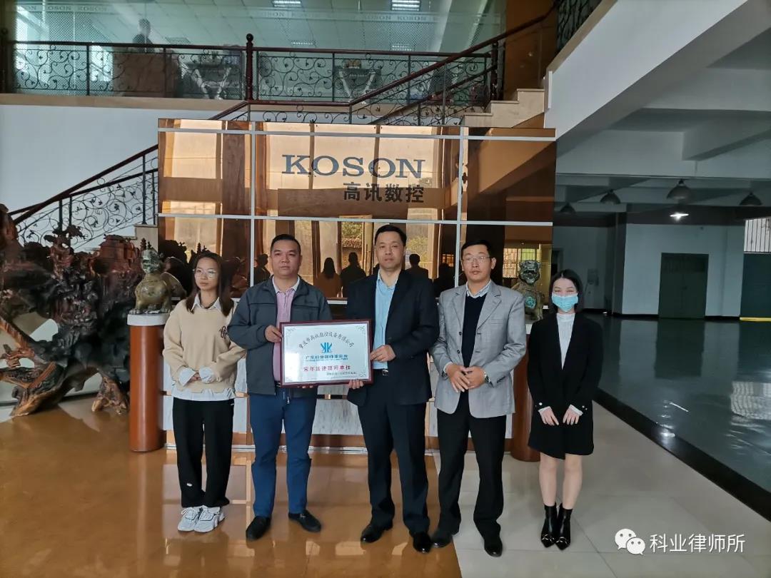 近日,广东科业律师团来到了肇庆市高讯数控设备有限公司,进行了挂牌仪式,并参观了该企业运营情况,解决了其常年的法律困扰。