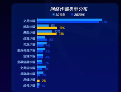 从2020年高发的典型诈骗类型来看,往年的春节期间往往是网络诈骗率的低发时间,但今年由于疫情原因,相关的网络诈骗呈现上升趋势。从数据来看,哄抬物价占比78.1%,疫情诈骗占比27.4%(主要指交易口罩,募捐诈骗,疫情物资诈骗,疫苗诈骗等。)疫情期间口罩成为必需品,有人囤积口罩,收款不发货;还有的谎称发防疫补贴,发虚假红包链接实施诈骗。